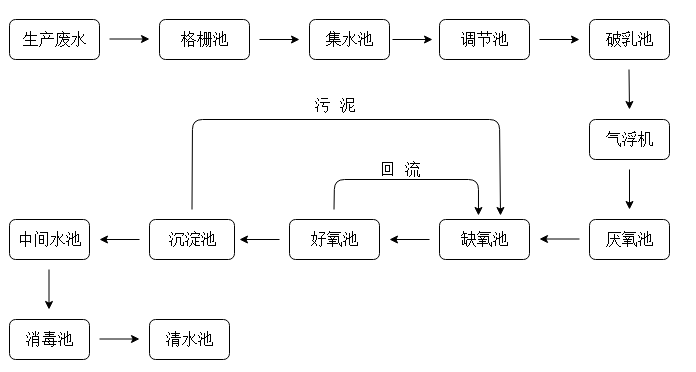 (1)預處理:廢水進入格柵池通過格柵截留大顆粒物質(zhì),再自流入調(diào)節(jié)池以平衡水質(zhì)水量,使廢水均勻進入后續(xù)處理單元;
